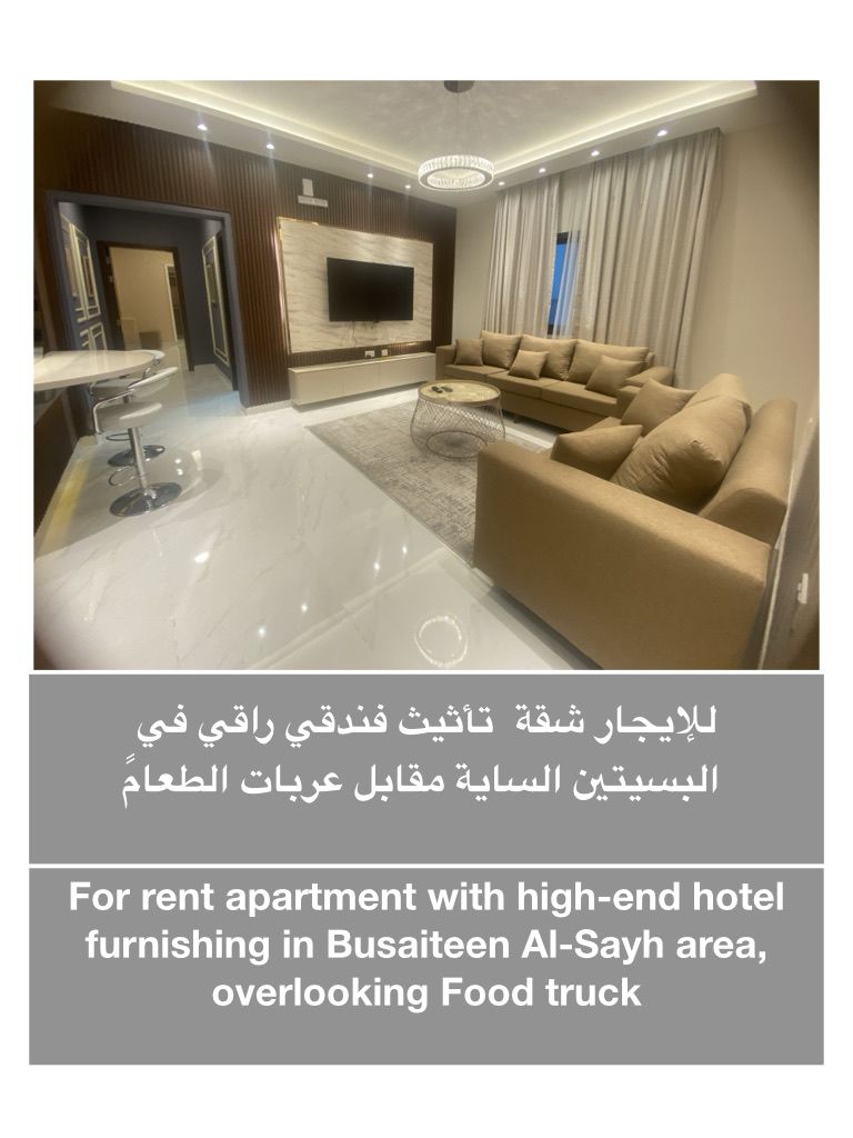 للإيجار: شقة فخمة بتأثيث فندقي في البسيتين الساية، مطلة على عربات الطعام. تحتوي على غرفتين نوم، حمامين، صالة، ومطبخ. السعر 420 دينار، مع حد للكهرباء 20 دينار.