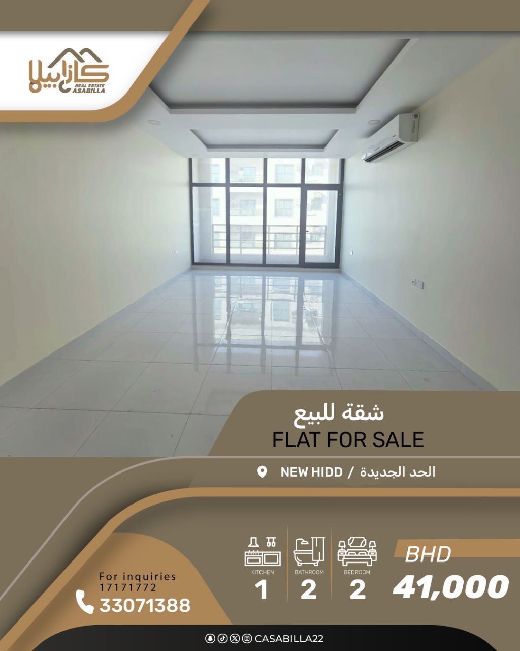 للبيع: شقة في منطقة هادئة وراقية في الحد، مع إطلالة جزئية على البحر. أولاً، تفاصيل الشقة: غرفتي نوم، حمامان، صالة واسعة، مطبخ عربي، بلكونة. ثانياً، المرافق والخدمات: موقف لسيارتين، مكيفات سبليت، كاميرات أمنية، مصعد، منطقة هادئة وراقية. ثالثاً، المساحة والسعر: المساحة 109 متر مربع، السعر 41,000 دينار بحريني. للمزيد من المعلومات، يرجى الاتصال.