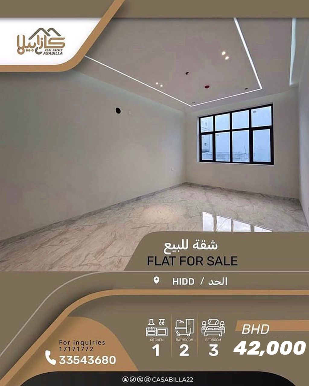 للبيع: شقة جديدة في الحد بسعر تنافسي. أولاً، تفاصيل الشقة: 3 غرف، إحداها غرفة نوم رئيسية، حمامان، صالة واحدة، مطبخ واحد. ثانياً، المرافق والخدمات: حارس للمبنى، مصعد، قريبة من جميع الخدمات، موقف سيارات مظلل. ثالثاً، السعر والمساحة: السعر 42,000 دينار، المساحة 100 متر مربع. للتواصل.