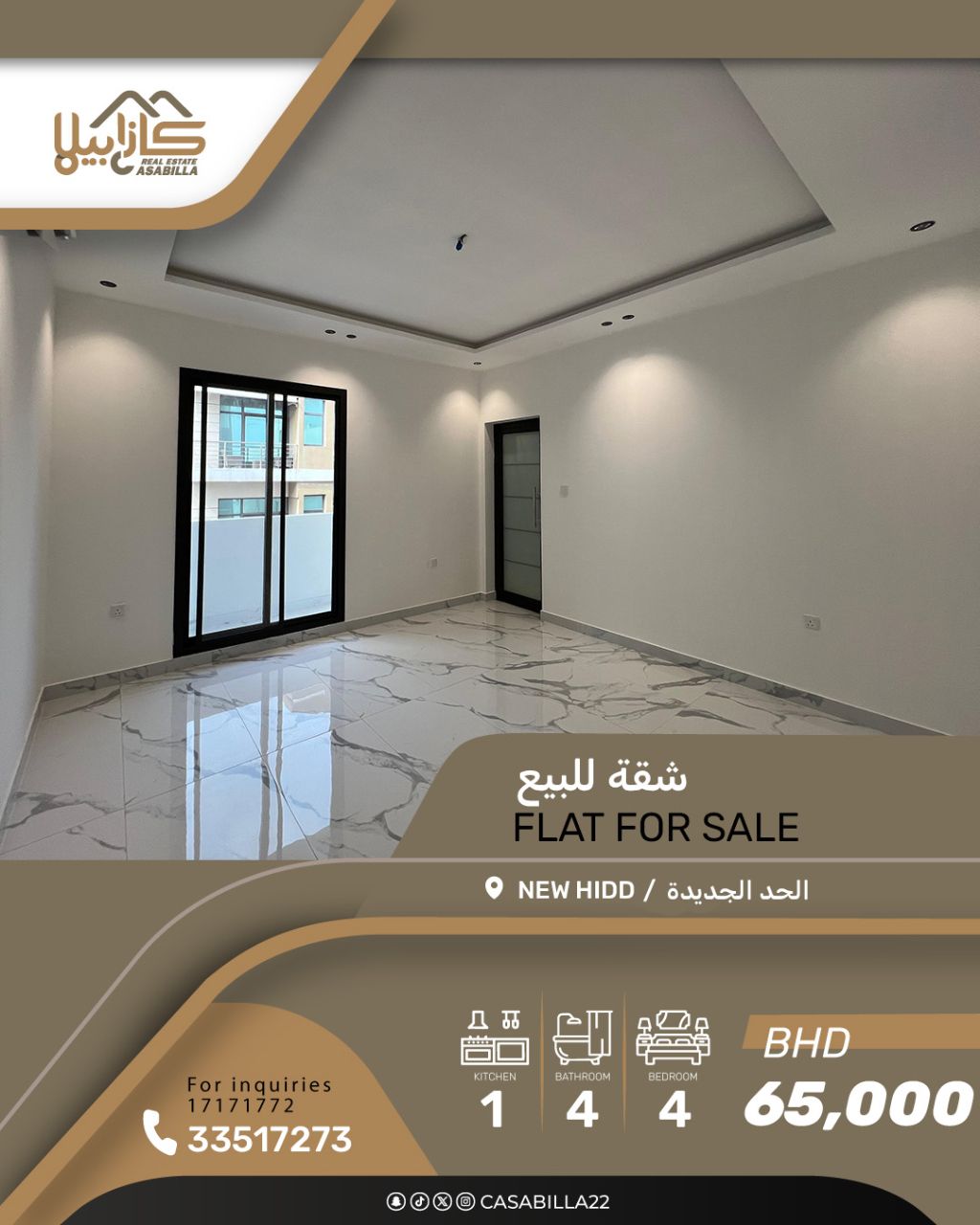 للبيع: شقة في منطقة الحد الجديدة، قريبة من جميع الخدمات، بتشطيب راقٍ. أولاً، تفاصيل الشقة: 1 مجلس رجال مع حمام، 1 صالة عائلية واسعة، 3 غرف نوم منها غرفتين ماستر، 4 حمامات، 1 مطبخ، 3 بلكونات. ثانياً، المرافق والخدمات: يوجد صرف صحي، موقف سيارة مظلل، مكيفات سبليت، قرب الخدمات والمرافق العامة، قرب المسجد. ثالثاً، المساحات: 200 متر مربع في الخرائط الهندسية، 180 متر مربع في الوثيقة. رابعاً، السعر: 65,000 دينار بحريني.