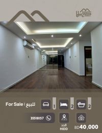 للبيع شقة في منطقة الحد الجديدة، تتكون من غرفتي نوم، صالة عائلية واسعة، مطبخ، حمامين، بالكونة مع المكيفات، ومطبخ مجهز بالكامل. المساحة 105 متر مربع. السعر 40 ألف دينار. للاستفسار.