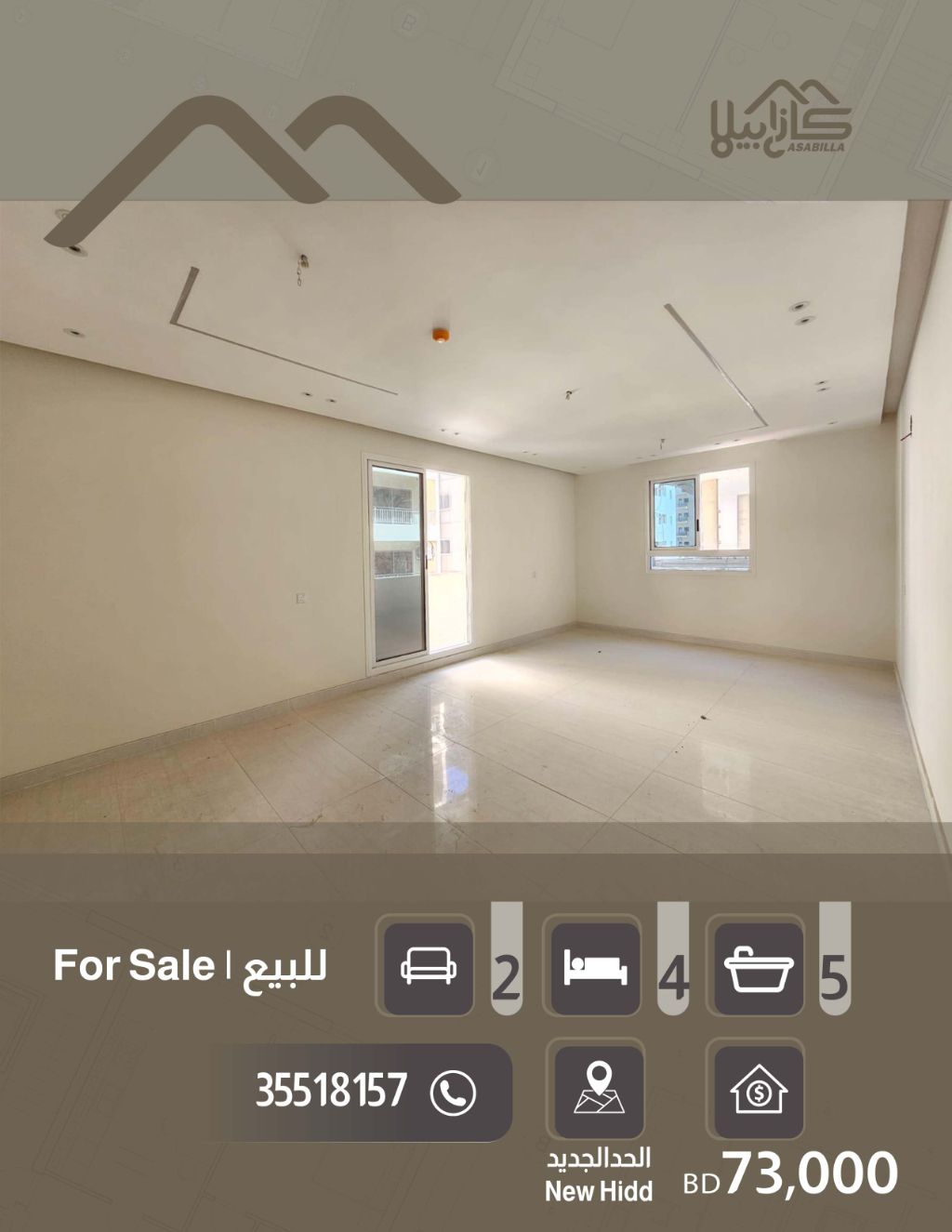 للبيع: شقة طابق واحد مع مدخلين في منطقة الحد الجديدة، قريبة من جميع الخدمات. أولاً، تفاصيل الشقة: 1 مجلس خاص بالرجال مع حمام، 1 صالة عائلية واسعة مع بلكونة، 1 صالة طعام، 4 غرف نوم منها 3 ماستر، 5 حمامات، 3 بلكونات. ثانياً، المرافق والخدمات: نظام شقتين، موقفين لسيارتين، طابق واحد، قرب الخدمات والمرافق العامة. ثالثاً، المساحة والسعر: المساحة 211.7 متر مربع، السعر 73,000 ألف دينار. للتواصل.