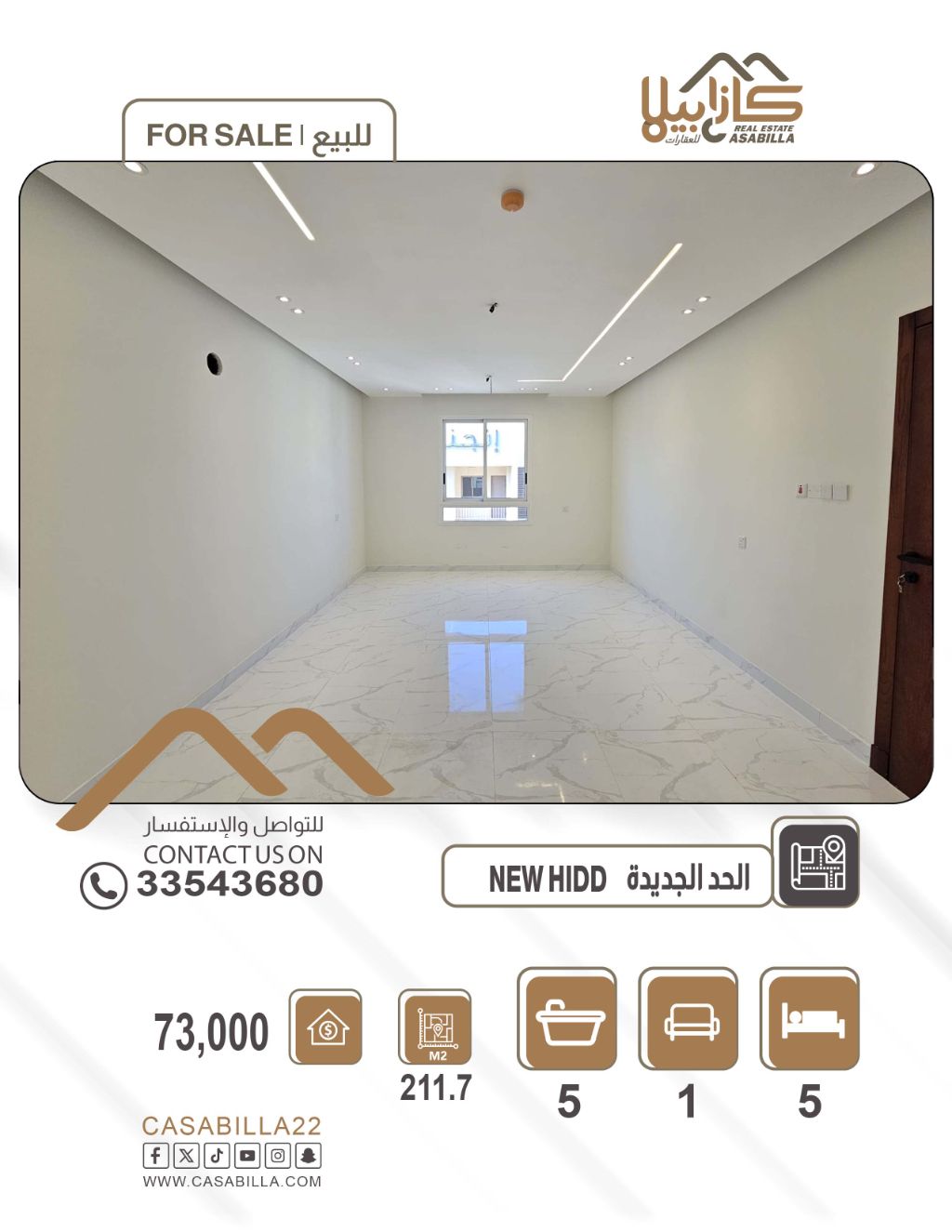 للبيع: شقة طابق واحد في الحد، قريبة من جميع الخدمات. أولاً، تفاصيل الشقة: 1 مجلس خاص بالرجال مع حمام، 1 صالة عائلية واسعة مع بلكونة، 1 صالة طعام، 4 غرف نوم منها 3 ماستر، 5 حمامات، 3 بلكونات. ثانياً، المرافق والخدمات: نظام شقتين، موقفين لسيارتين، طابق واحد، قرب الخدمات والمرافق العامة. ثالثاً، المساحة والسعر: المساحة 211.7 متر مربع، السعر 73,000 ألف دينار. للتواصل.