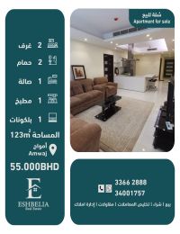 فرصة لا تُعوّض: شقة مفروشة بالكامل للبيع في منطقة جميلة جداً في أمواج. تتكون من 2 غرفة نوم، 2 حمام، 1 مطبخ، 1 صالة، و1 بلكونة. مساحتها 123 متراً مربعاً. السعر المطلوب 55,000 دينار. للتواصل: مكتب إشبيلية بوعبدالله، رقم الرخصة B201804 / 0125. رقم الإعلان (98).