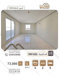 للبيع: شقة طابق واحد مع مدخلين في منطقة الحد الجديدة، قريبة من جميع الخدمات. أولاً، تفاصيل الشقة: 1 مجلس خاص بالرجال مع حمام، 1 صالة عائلية واسعة مع بلكونة، 1 صالة طعام، 4 غرف نوم منها 3 ماستر، 5 حمامات، 3 بلكونات. ثانياً، المرافق والخدمات: نظام شقتين، موقفين لسيارتين، طابق واحد، قرب الخدمات والمرافق العامة. ثالثاً، المساحة والسعر: المساحة 211.7 متر مربع، السعر 73,000 ألف دينار. للتواصل.