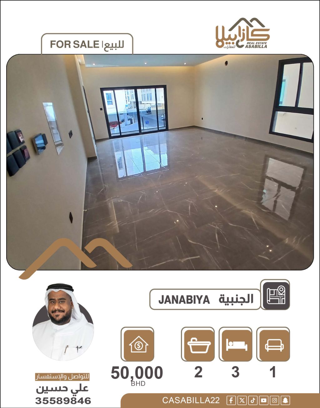 شقة ذكية باطلالة أمامية ومرافق متكاملة في الجنبية. شقة عصرية بمساحة 101 متر مربع، تتميز باطلالة أمامية وشرحة في قلب الجنبية. تجمع بين التكنولوجيا الحديثة والرفاهية، مع ضمانات شاملة تمنحك راحة البال. المواصفات: 3 غرف نوم - مطبخ راكب بتصميم أنيق - دورتين مياه - نظام البيت الذكي (Smart Home) للتحكم الذكي في الإضاءة والدخول - المرافق تشمل مصعد حديث وجيم مجهز بالكامل - الضمانات: جميع الضمانات متوفرة على البناية بالكامل.