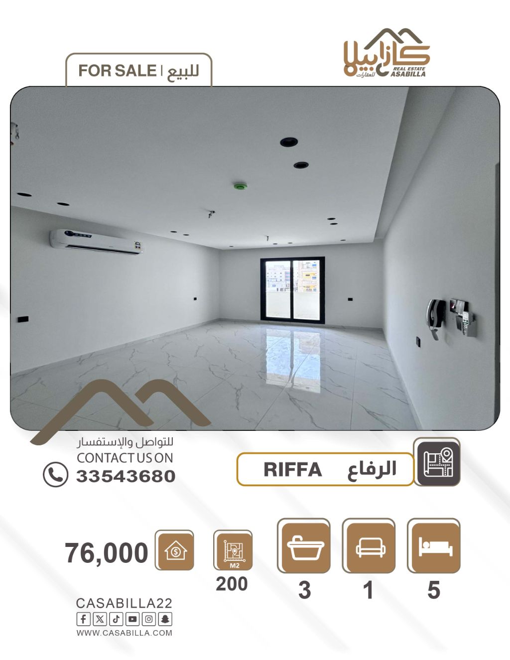 للبيع: شقة جديدة كبيرة في منطقة الرفاع. تفاصيل الشقة: مجلس مع حمام، صالة واسعة مع بلكونة، 4 غرف نوم، مطبخ مع بلكونة، مرافق وخدمات تشمل مكيفات هواء، مصعد، وموقع مميز جداً. المساحة: 200 متر مربع. السعر: 76,000 دينار. للتواصل.
