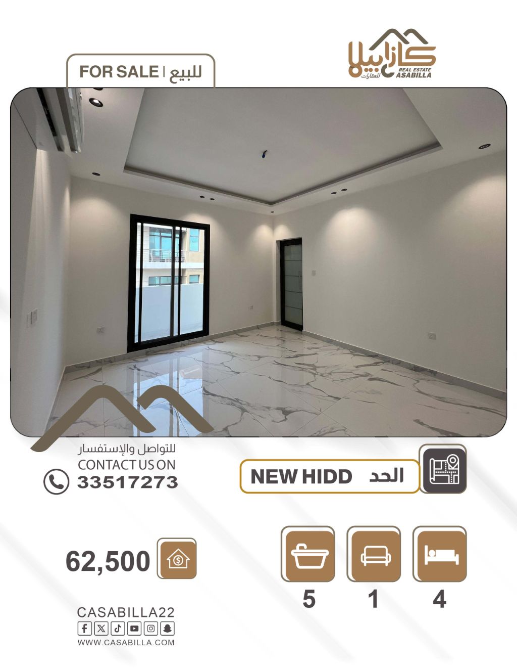 فرصة: شقة للبيع في موقع مميز بمنطقة الحد الجديدة، قريبة من جميع الخدمات. تشطيب راقي. أولاً، تفاصيل الشقة: 1 مجلس رجال مع حمام، 1 صالة عائلية واسعة، 3 غرف نوم منها غرفتين ماستر، 4 حمامات، 1 مطبخ، 3 بلكونات. ثانياً، المرافق والخدمات: يوجد صرف صحي، موقف سيارة مظلل، مكيفات سبليت، قرب الخدمات والمرافق العامة، قرب المسجد والسوبر ماركت. رابعاً، السعر: 62,500 دينار. للاتصال.