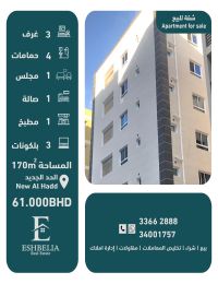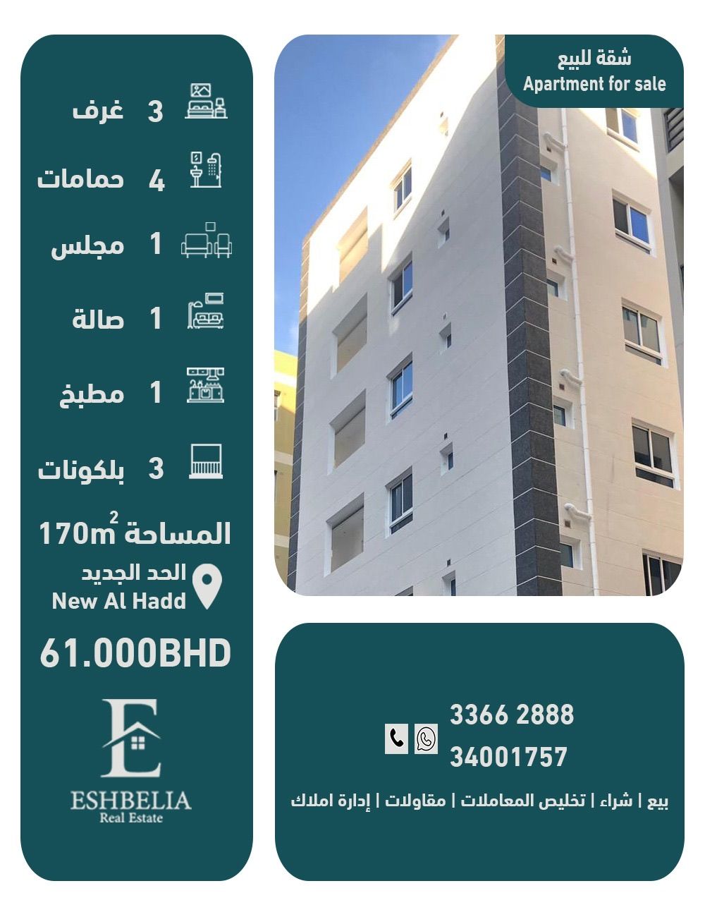 فرصة العمر! لدينا (12) شقة للبيع، راقية وأول ساكن، في منطقة جميلة جداً في الحد الجديد، نظام عربي، قريبة من الخدمات. تتكون كل شقة من: 3 - غرف نوم واسعة، 4 - حمامات، 1 - مجلس، 1 - صالة، 1 - مطبخ، 3 - بلكونات. ملاحظة: يوجد مدخلين للشقة. المساحة: (170) متر مربع. سعر البيع: (61) ألف دينار. للتواصل: مكتب إشبيلية للقارات، B201804 / 0125. رقم الرخصة. رقم الإعلان (114).