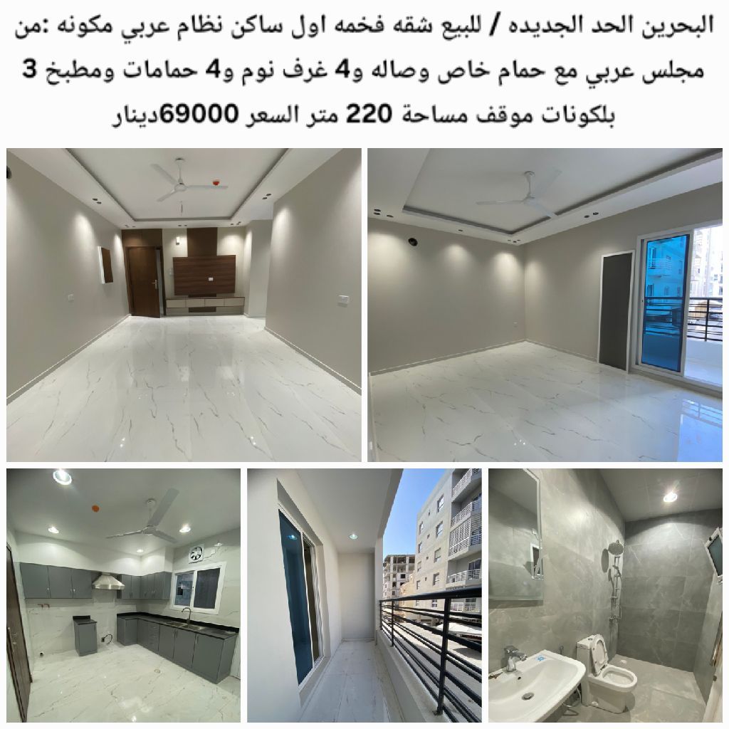 الحد الجديدة، البحرين / للبيع: شقة فخمة، أول ساكن، نظام عربي، مكونة من مجلس عربي مع حمام خاص، وصالة، و4 غرف نوم، و4 حمامات، ومطبخ، و3 بلكونات، وموقف، مساحة 220 متر مربع، السعر 69,000 دينار.