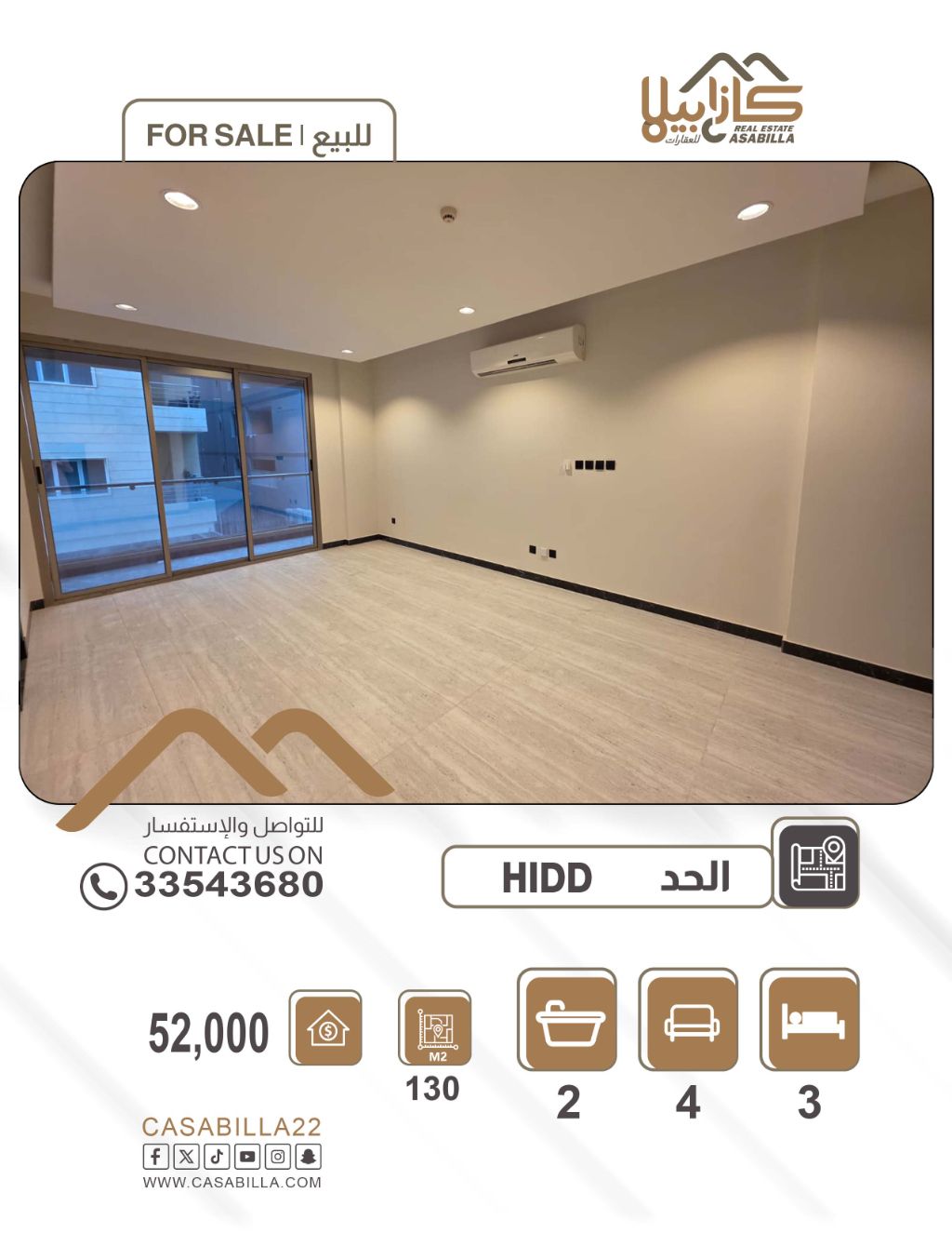 للبيع شقة فخمة بمنطقة الحد. تفاصيل الشقة: 3 غرف (غرفة ماستر)، 2 حمامين، صالة واسعة مع بلكونة، 2 بلكونتين، مطبخ. المرافق والخدمات: الشقة مع المكيفات، مصعد، موقف سيارة خاص. البناية زاوية وموقع مميز. المساحة: 130 مترًا. السعر: 52 ألف دينار. للتواصل.