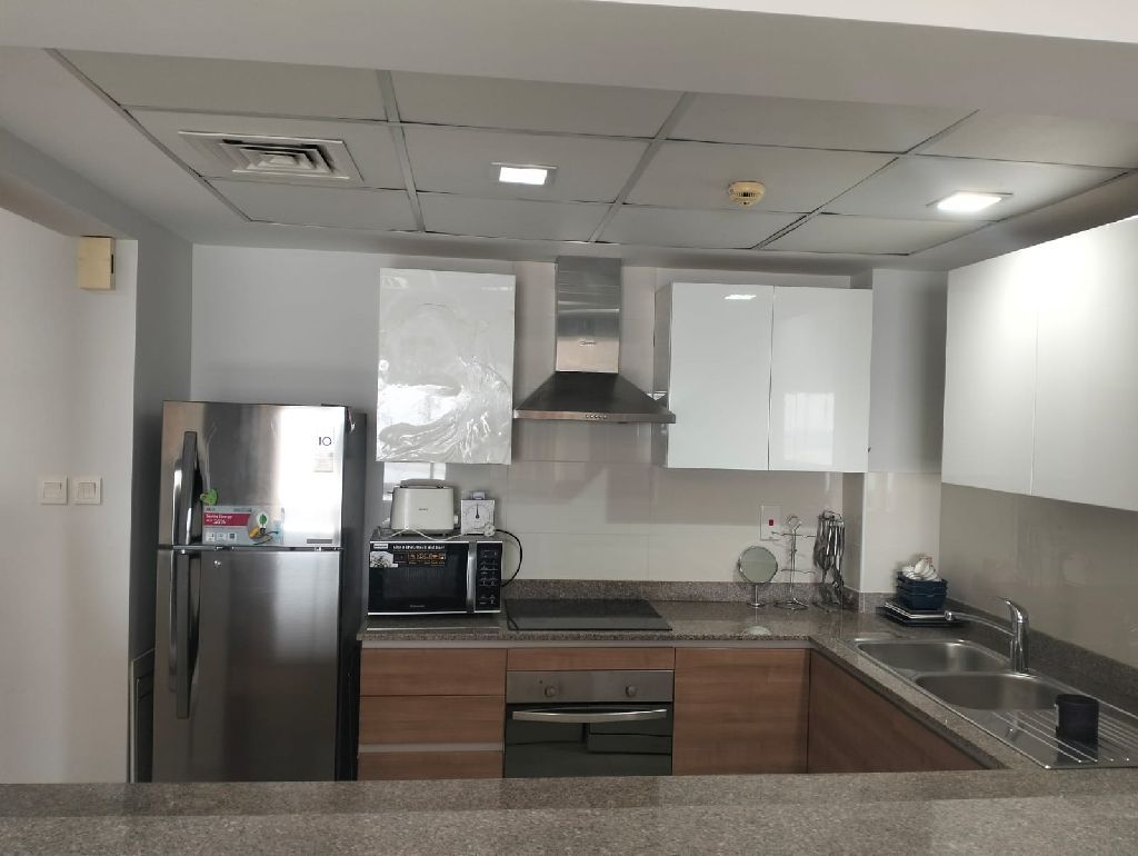 For sale A luxurious apartment in Amwaj, corner unit, 16th floor. Features 140 SQM - 2 bedrooms (1 en - suite bathroom) 2 bathrooms. Balcony with sea view - living room - fully equipped open kitchen connected to the living room - central air conditioning - laundry facilities (separate for women and men) children'playroom - maintenance support - owner association fees from 800 to 90. Asking
