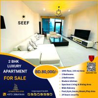 High Luxurious 2 BHK Apartment for sale in Seef Near City Center BD80000. This high luxurious fully furnished apartment is located near City Center. 133 SQM Area, situated on the 18th Floor of the Building. The apartment consists of 2 spacious bedrooms, 2 bathrooms, a spacious living & dining area, an equipped modern kitchen, and a wide - view balcony. We are providing high luxurious services like