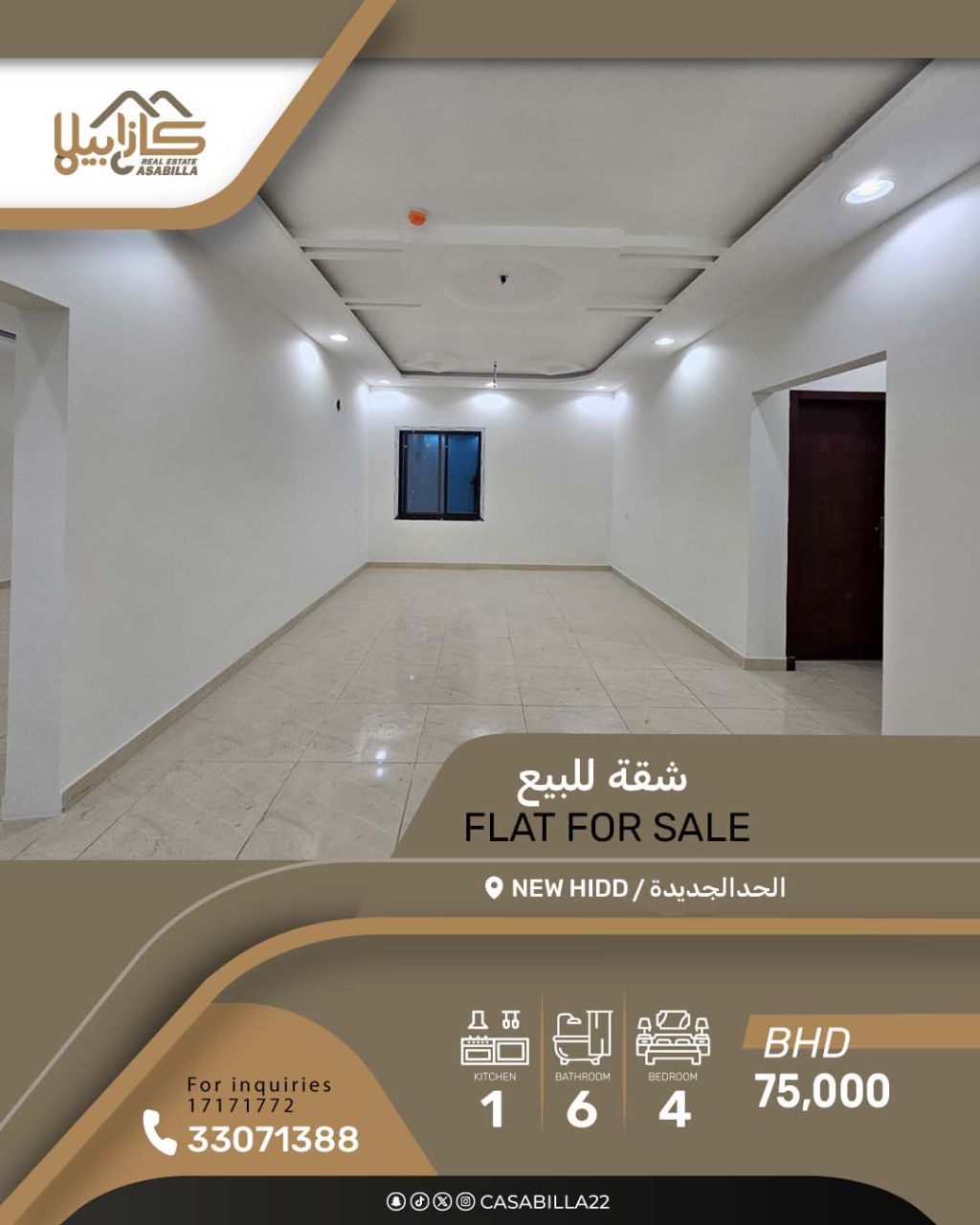 For sale: A single-story apartment in the New Hidd area, close to all services. First, apartment details: 1 men's living room with a bathroom, 1 spacious family living room with a balcony, 4 bedrooms including 3 master bedrooms, 6 bathrooms, 2 balconies. Second, facilities and services: Parking for two cars, single-story, near services and public facilities. Third, area and price: Area 240 square meters, price 75,000 Bahraini dinars. For contact.