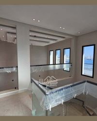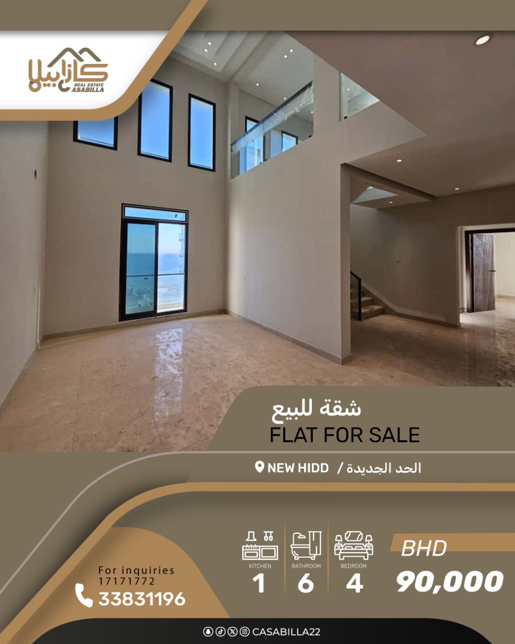 For sale: A duplex with deluxe finishing in a quiet and upscale area in New Hidd. First, apartment details: 4 bedrooms, 2 family living rooms, 6 bathrooms, 1 kitchen, 2 balconies. Note: There is a private rooftop space. Second, facilities and services: shaded parking, elevator, close to amenities. Third, area and price: area 300 square meters, price 90,000 dinars. For contact.