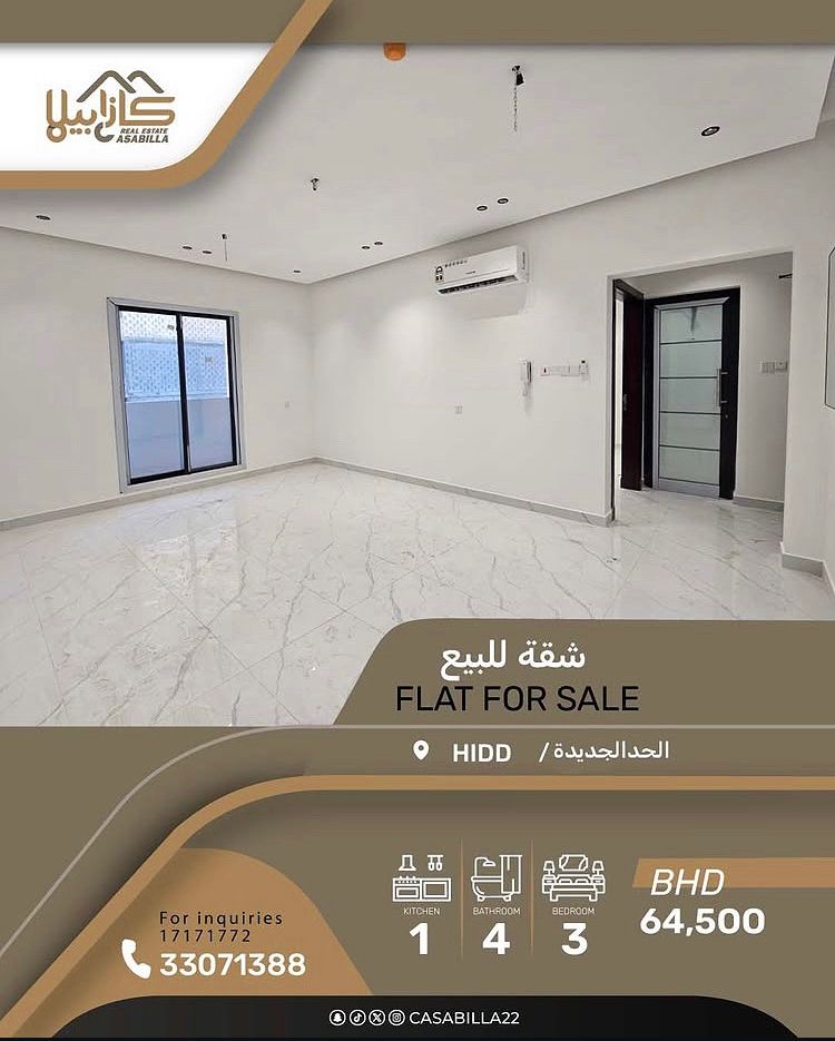 For sale: A deluxe Arabian-style apartment with split air conditioners in the New Hidd area, close to services. First, apartment details: 1 men's living room, 1 family living room with balcony, 1 kitchen with balcony, 1 maid's room, 3 bedrooms including two master bedrooms, 4 bathrooms. Second, facilities and services: split air conditioners, elevator, shaded car parking, close to services. Third, area and price: area approximately 200 square meters, price 64,500 thousand dinars. For contact and inquiries.