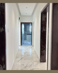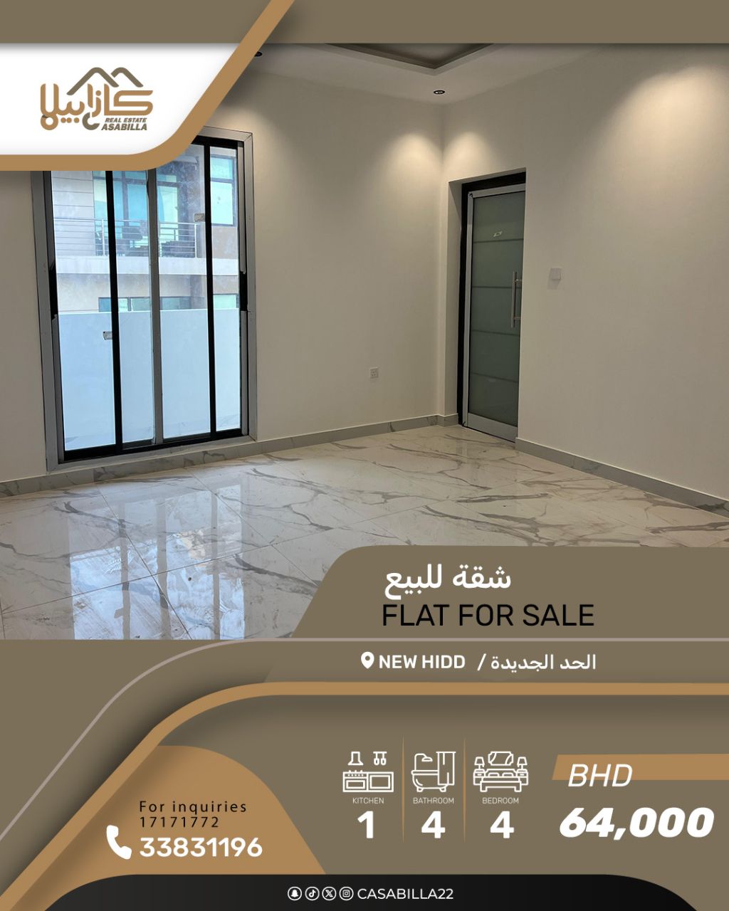 For sale: A deluxe duplex near Al Anjal station in New Hidd. First, apartment details: 4 bedrooms, 1 family living room, 4 bathrooms, 1 kitchen, 1 balcony. Note: Only two apartments per floor. Second, facilities and services: Shaded parking, elevator, close to services. Third, area and price: Area 200 square meters, price 64,000 dinars. For contact.
