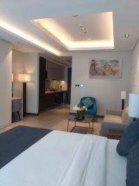 Dominions Real Estate for sale: A furnished residential apartment for sale in Seef - opposite City Centre. Location: Seef area, opposite City Centre mall. Area: 47.90 square meters. Floor: 34th floor (top floor). Type: Studio apartment. Parking: Multi-level parking inside the building. Apartment features: Central air conditioning with control system, fiber internet service, fully furnished with modern design. Reference: 5437