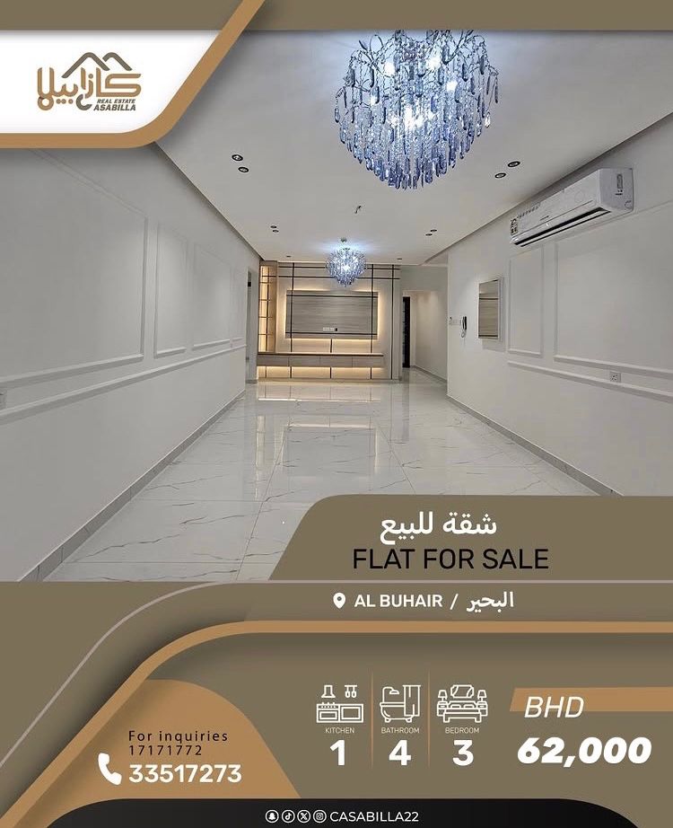 For sale: a deluxe apartment with air conditioners in a prime location in Al Buhair. First, apartment details: 1 family living room with a balcony, 3 master bedrooms with bathrooms, 4 bathrooms, 3 balconies, 1 Arabic kitchen, 1 laundry room. Second, facilities and services: elevator, split air conditioners, shaded parking, near a petrol station. Third, area and price: area 150 square meters, price 62,000 Bahraini dinars negotiable. For contact and inquiries.