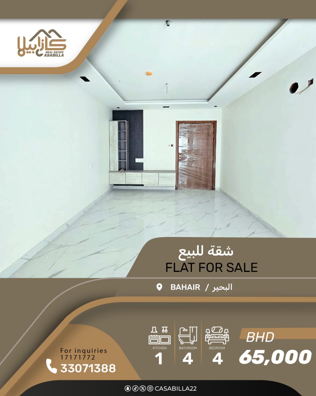 For sale: An apartment with deluxe finishing in a quiet and upscale area in Bahrain. First, apartment details: 1 men's living room, 1 family living room, 3 bedrooms including 2 master bedrooms, 4 bathrooms, 1 kitchen with a balcony. Second, facilities and services: 2 elevators, private parking, near Independence Walk, near Al Salam Hospital, near schools. Third, area and price: Area 170 sqm, price 65,000 Bahraini dinars. For more information, please contact.