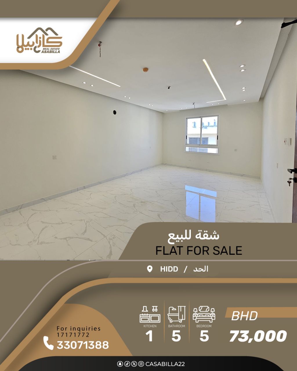 For sale: A single-floor apartment with two entrances in the New Hidd area, close to all services. First, apartment details: 1 men's living room with a bathroom, 1 spacious family living room with a balcony, 1 dining room, 4 bedrooms including 3 master bedrooms, 5 bathrooms, 3 balconies. Second, facilities and services: Two-apartment system, two car parking spaces, single floor, proximity to services and public facilities. Third, area and price: Area 211.7 square meters, price 73,000 Bahraini dinars. For contact.