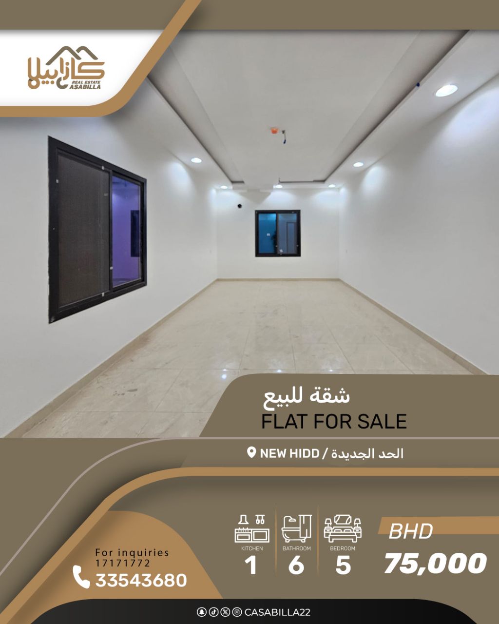 For sale: A single-story apartment in the New Hidd area, close to all services. First, apartment details: 1 men's living room with a bathroom, 1 spacious family living room with a balcony, 4 bedrooms including 3 master bedrooms, 6 bathrooms, and 2 balconies. Second, facilities and services: Parking for two cars, single-story, near services and public facilities. Third, area and price: Area 240 square meters, price 75,000 Bahraini dinars. For contact.