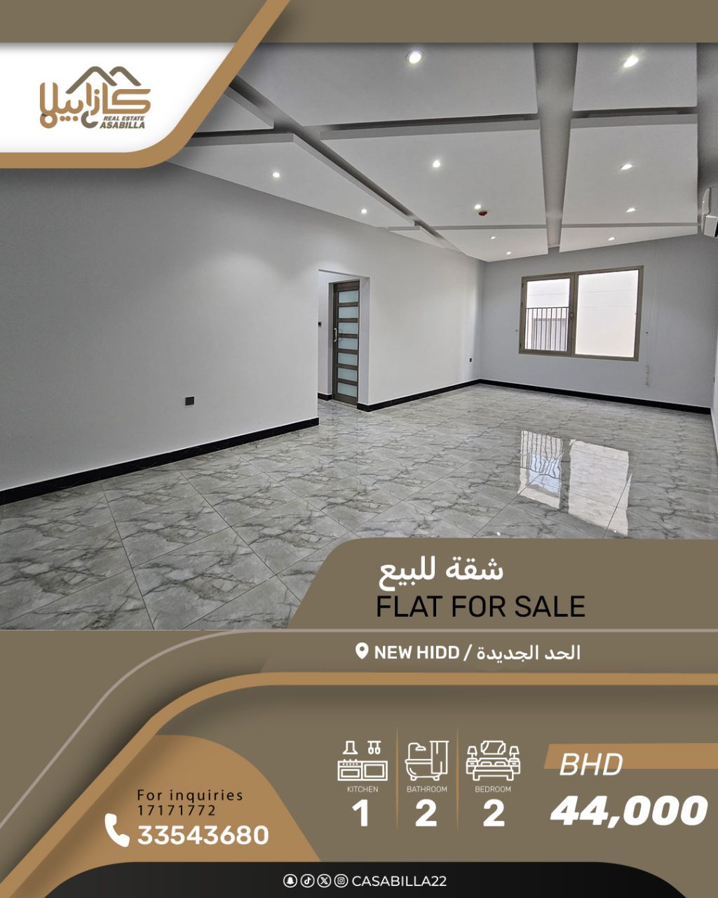 For sale: A freehold apartment for all nationalities in the New Border area, close to all services. First, apartment details: 1 large family living room, 2 bedrooms, 2 bathrooms, 1 kitchen. Area: 100 square meters, Price: 44,000 dinars.