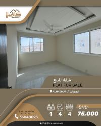 For sale: a luxurious apartment in the Al Rifaa Al Hajiyat area. First, apartment details: 4 rooms (2 of them master bedrooms), 4 bathrooms, a separate majlis with a balcony and bathroom and laundry area, a spacious hall with a balcony, a kitchen with a balcony, and 3 balconies in total. Second, facilities and services: parking space, elevator, surveillance cameras. Area: 218 square meters. Price: 75,000 Bahraini dinars.