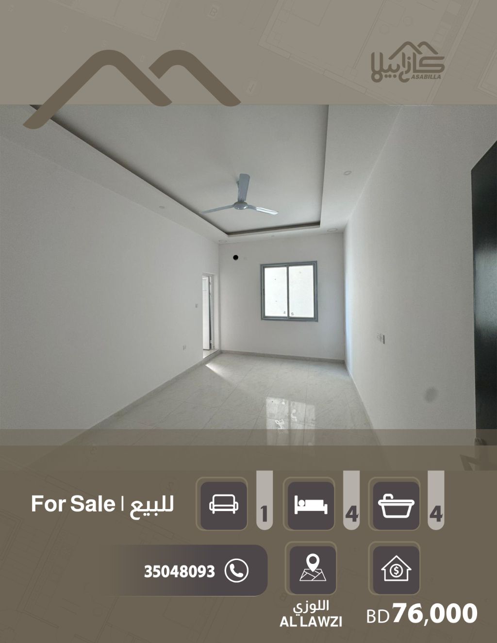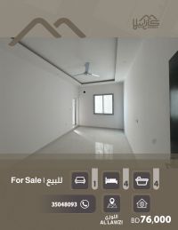 For sale: A luxurious and new apartment, first occupancy, in the Al-Lawzi area. First, apartment details: Each floor has one apartment with 4 bedrooms (2 of them are master bedrooms, 2 have balconies), 4 bathrooms, a living room with an isolated bathroom, a spacious hall with a balcony, and a kitchen with a balcony. Second, facilities and services: Close to markets and all services, shaded car parking, elevator, surveillance cameras. Area: 220 square meters. Price: 76,000 BHD and negotiable with a small amount. Contact for inquiries.