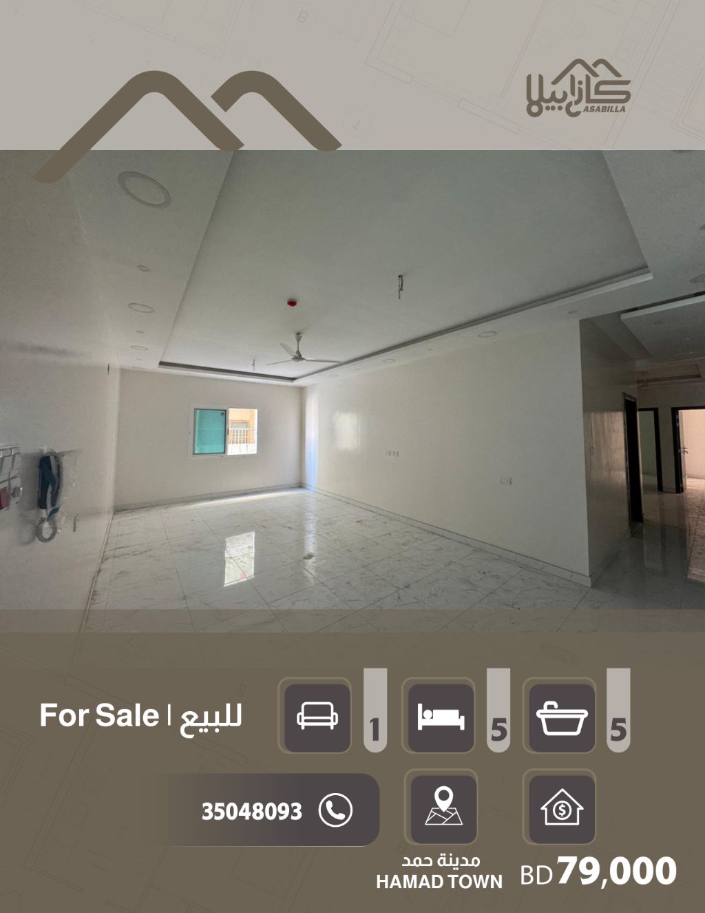 For sale: Luxurious residential apartments in Hamad City - Roundabout 2. A new building on an open front street and on a corner. A luxurious and new apartment (first occupant) with high-quality finishing and a prime location. Apartment details: A separate majlis with a private bathroom, sink, and an isolated door for privacy - 4 bedrooms (including two master bedrooms) - A spacious living room - A ready and equipped kitchen with a balcony - 4 bathrooms - Apartment area: 219 square meters. Facilities and services: Private parking for each apartment - Elevator - Surveillance cameras. Price: 79,000 BHD.