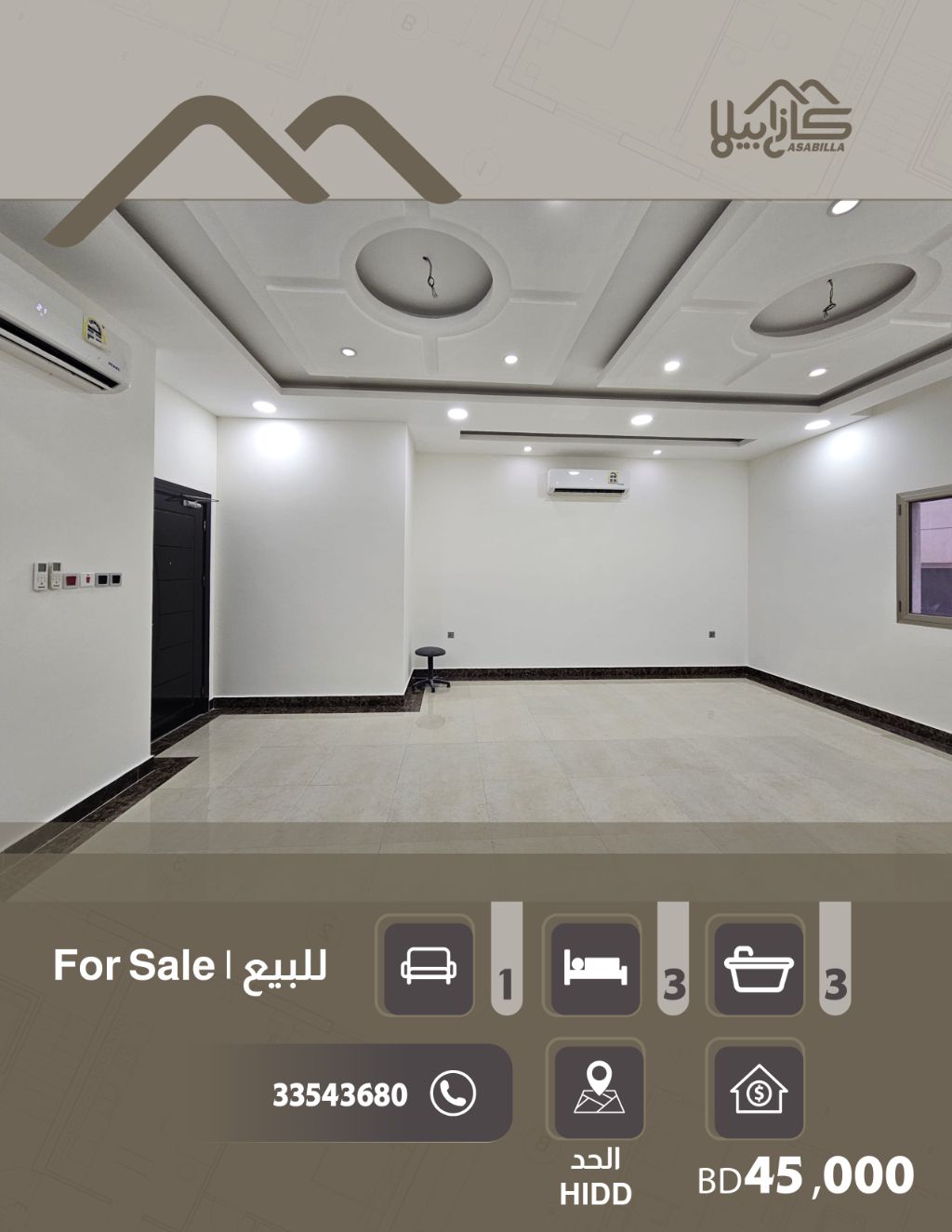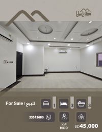 For sale: An apartment in the Al-Hadd New Area, close to all services. First, apartment details: 1 spacious family living room, 3 bedrooms, 3 bathrooms, 1 kitchen. Second, facilities and services: shaded parking, split air conditioners, proximity to services and public facilities, near a mosque. Third, areas: area 125 square meters, price 45 thousand dinars. For contact.