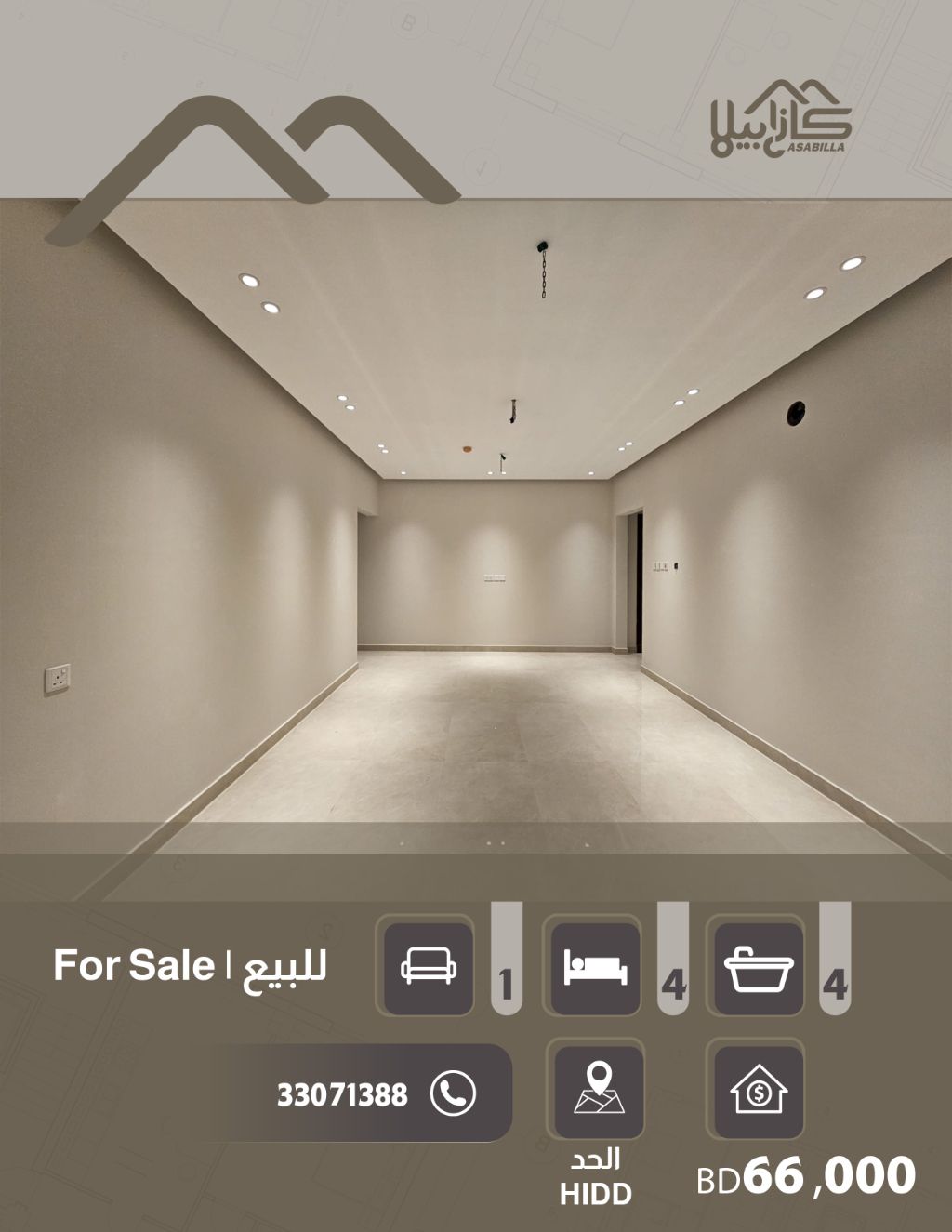 For sale: A freehold apartment for all in the Al-Hadd New area, close to all services. First, apartment details: 1 men's living room with bathroom, 1 family living room with balcony, 3 bedrooms including two master bedrooms, 4 bathrooms, 1 kitchen, 2 balconies. Second, facilities and services: shaded parking, sewage system, two elevators of Otis type, proximity to services and public facilities, proximity to mosque, cameras. Third, areas: area 175 square meters. Fourth, price: 66,000 thousand dinars. For contact.