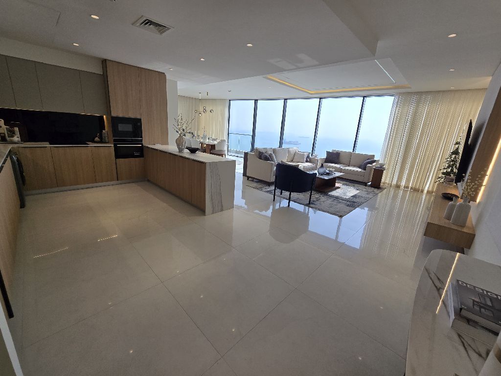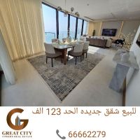 For sale: A brand new freehold apartment with a spacious sea view in Hidd. The apartment consists of 205 square meters, with a spacious living room, 3 bedrooms, 5 bathrooms, a maid's room, 2 swimming pools, a gym, 2 saunas (men and women), and 2 parking spaces. Prices start at 123,000 dinars. For inquiries, note that the apartment is unfurnished, with only central air conditioning.