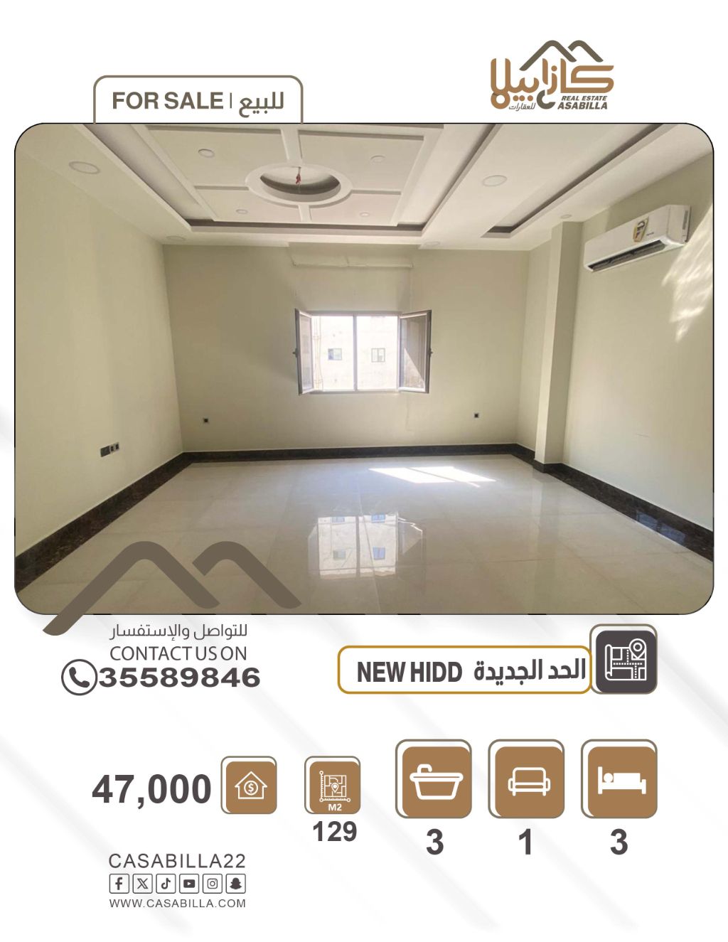 For sale: An apartment in Al-Hadd Al-Jadeed with an area of 129 square meters. It consists of 3 bedrooms, 3 bathrooms, a spacious living room, a kitchen, and a parking space. The location is excellent and close to all services. Price: 47,000 BHD. For contact and inquiries.