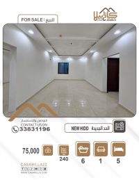 For sale: A single-floor apartment in the New Hadd area, close to all services. First, apartment details: 1 men's living room with a bathroom, 1 spacious family living room with a balcony, 4 bedrooms including 3 master bedrooms, 6 bathrooms, 2 balconies. Second, facilities and services: Parking for two cars, single floor, proximity to services and public facilities. Third, area and price: Area 240 square meters, price 75,000 thousand dinars. For contact.
