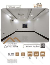 For sale: An apartment in the Al-Hadd New Area, close to all services. First, apartment details: 1 spacious family living room, 3 bedrooms, 3 bathrooms, 1 kitchen. Second, facilities and services: shaded car parking, proximity to services and public facilities, near a supermarket. Third, area and price: area 137 square meters, price 50,000 Bahraini dinars, negotiable. For contact.