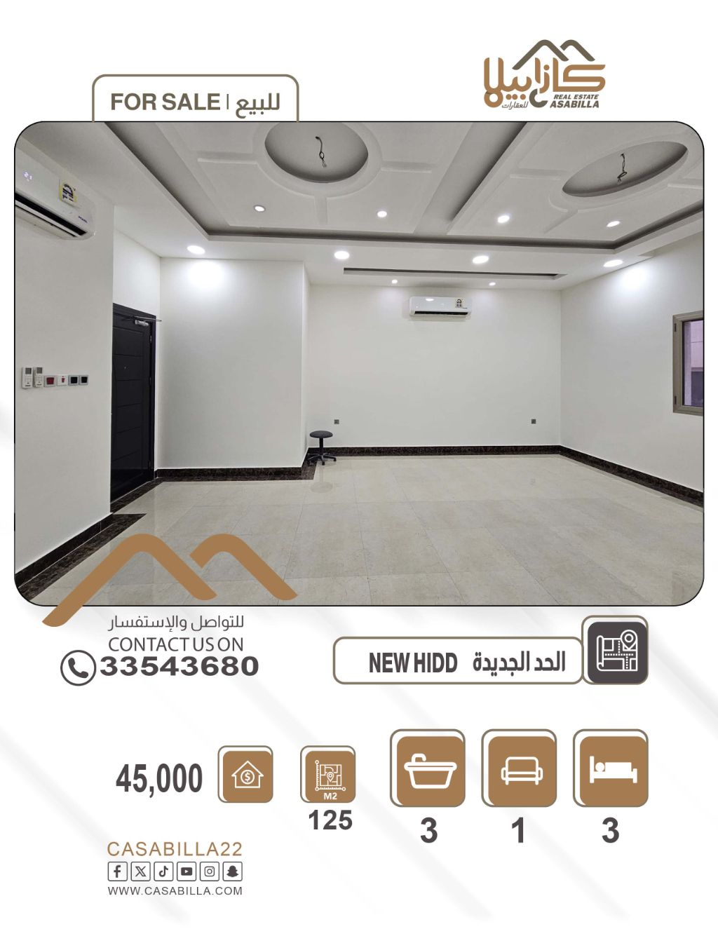 For sale: An apartment in the Al-Hadd New Area, close to all services. First, apartment details: 1 spacious family living room, 3 bedrooms, 3 bathrooms, 1 kitchen. Second, facilities and services: shaded parking, split air conditioners, proximity to services and public facilities, near a mosque. Third, areas: area 125 square meters, price 45 thousand dinars. For contact.