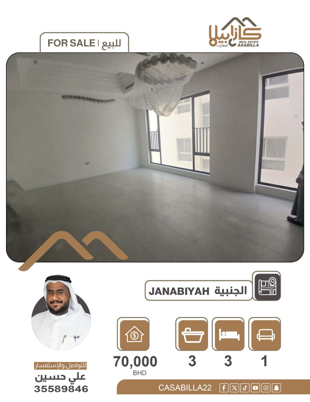 For sale: An apartment in Janabiya with 3 master bedrooms, area 130m. An excellent opportunity for living or investment in the upscale Janabiya area. A spacious apartment with modern design and excellent area that meets the needs of families. Specifications: 3 bedrooms (all master), 3 bathrooms, large and spacious living room, equipped kitchen, area 130 square meters. Sale price: 70,000 Bahraini dinars. For booking and inquiries.