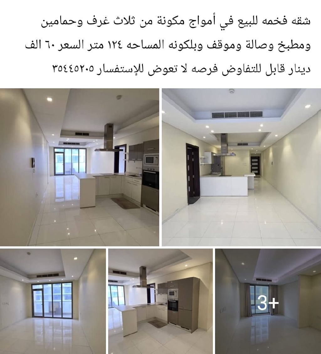 A luxurious apartment for sale in Amwaj, consisting of three rooms, two bathrooms, a kitchen, a living room, a parking space, and a balcony. The area is 124 square meters. The price is 60 thousand dinars, negotiable. An unmissable opportunity.