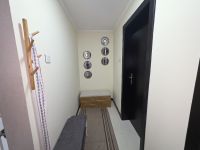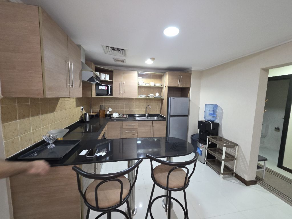 A fully furnished apartment for sale, consisting of one bedroom, a living room, a kitchen, two bathrooms, and a balcony. Price: 33,000 Bahraini dinars. Services include a gym, swimming pool, and multi-purpose hall. Location: Juffair.