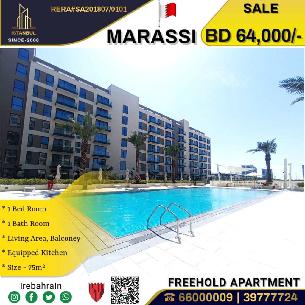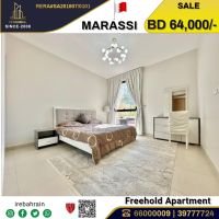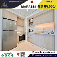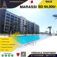 A luxurious fully furnished apartment for sale in the upscale Marasi Park residential complex for 64,000 Bahraini dinars. This beautiful furnished apartment, consisting of one bedroom and one bathroom, has a spacious area of 75 square meters and includes an open kitchen, laundry area, large balcony with direct access to the pool and gym, in addition to an elegant living room with a balcony. Residents enjoy world-class facilities including a wonderful pool, children's pool, and gym.