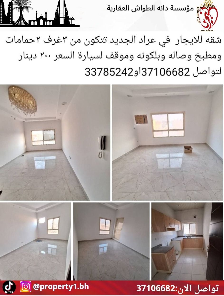 شقة للإيجار في عراد الجديد تتكون من 3 غرف، 2 حمامات، مطبخ، صالة، بالكونة، وموقف سيارة. السعر 200 دينار. للتواصل