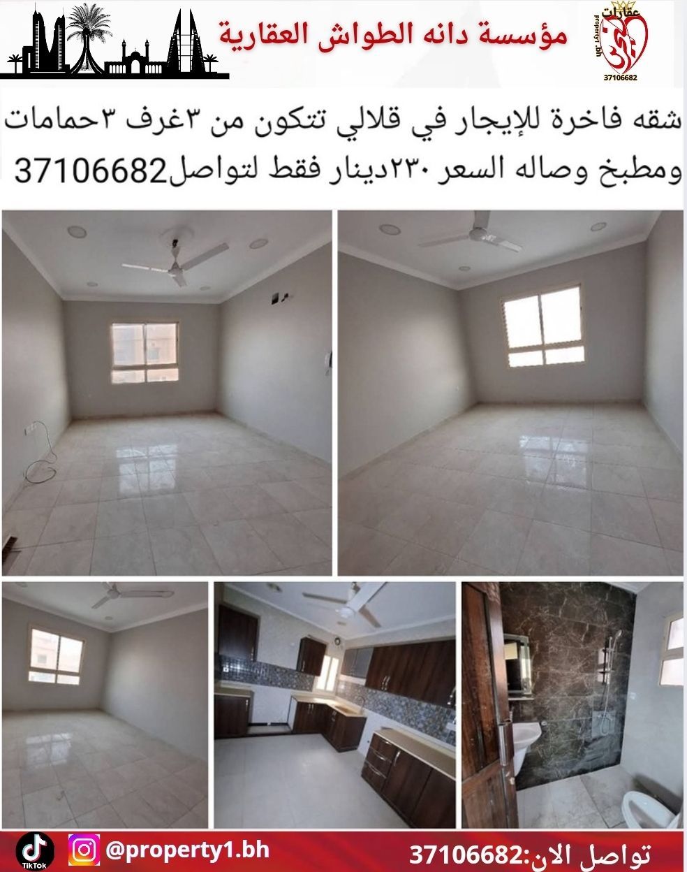 شقة فاخرة للإيجار في قلالي تتكون من 3 غرف، 3 حمامات، مطبخ، وصالة. السعر 220 دينار فقط للتواصل