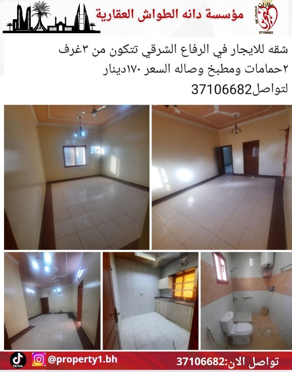 شقة للإيجار في الرفاع الشرقي تتكون من 3 غرف، حمامين، مطبخ، وصالة. السعر 170 دينار. للتواصل.