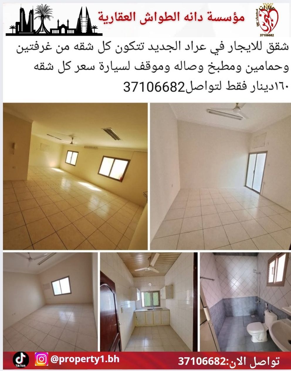 شقق للإيجار في عراد الجديد. تتكون كل شقة من غرفتين وحمامين ومطبخ وصالة وموقف لسيارة. سعر كل شقة 150 دينار فقط، وشهر مجاني للمستأجر. للتواصل