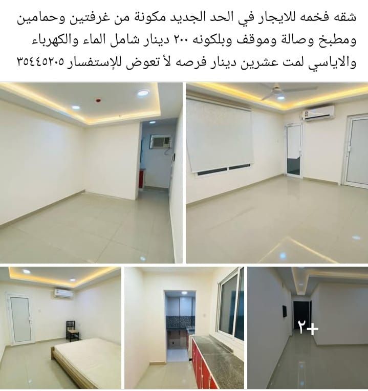 شقة فاخرة للإيجار في الحد الجديد، تتكون من غرفتين وحمامين ومطبخ وصالة وموقف سيارات وبلكونة بمبلغ 200 دينار، تشمل الماء والكهرباء، مع تكييف بمبلغ إضافي 20 دينار. فرصة لا تعوض.