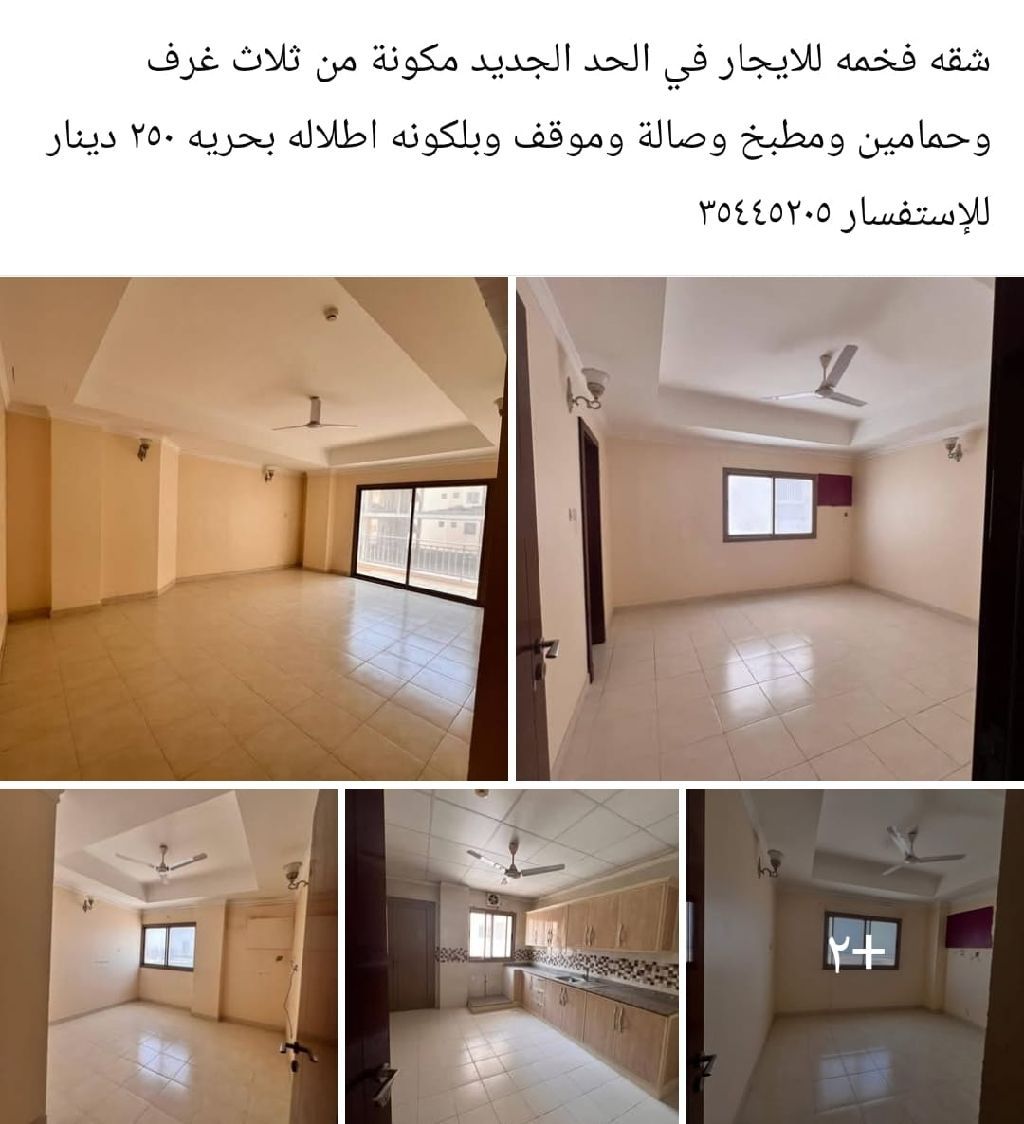 شقة فاخرة للإيجار في الحد، تتكون من 3 غرف، حمامين، مطبخ، صالة، موقف سيارة، وبلكونه بإطلالة بحرية، بسعر 250 دينار.