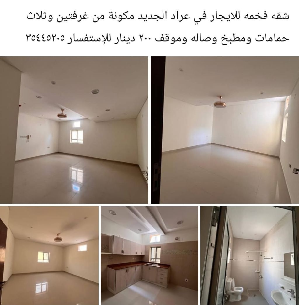 شقة فاخرة للإيجار في عراد الجديد، تتكون من غرفتي نوم وثلاثة حمامات ومطبخ وصالة وموقف سيارات بسعر 200 دينار