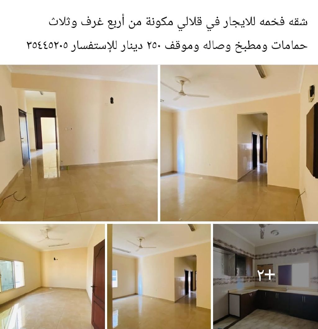 شقة فاخرة للإيجار في قلالي، تتكون من 4 غرف و3 حمامات ومطبخ وصالة وموقف سيارات بسعر 250 دينار