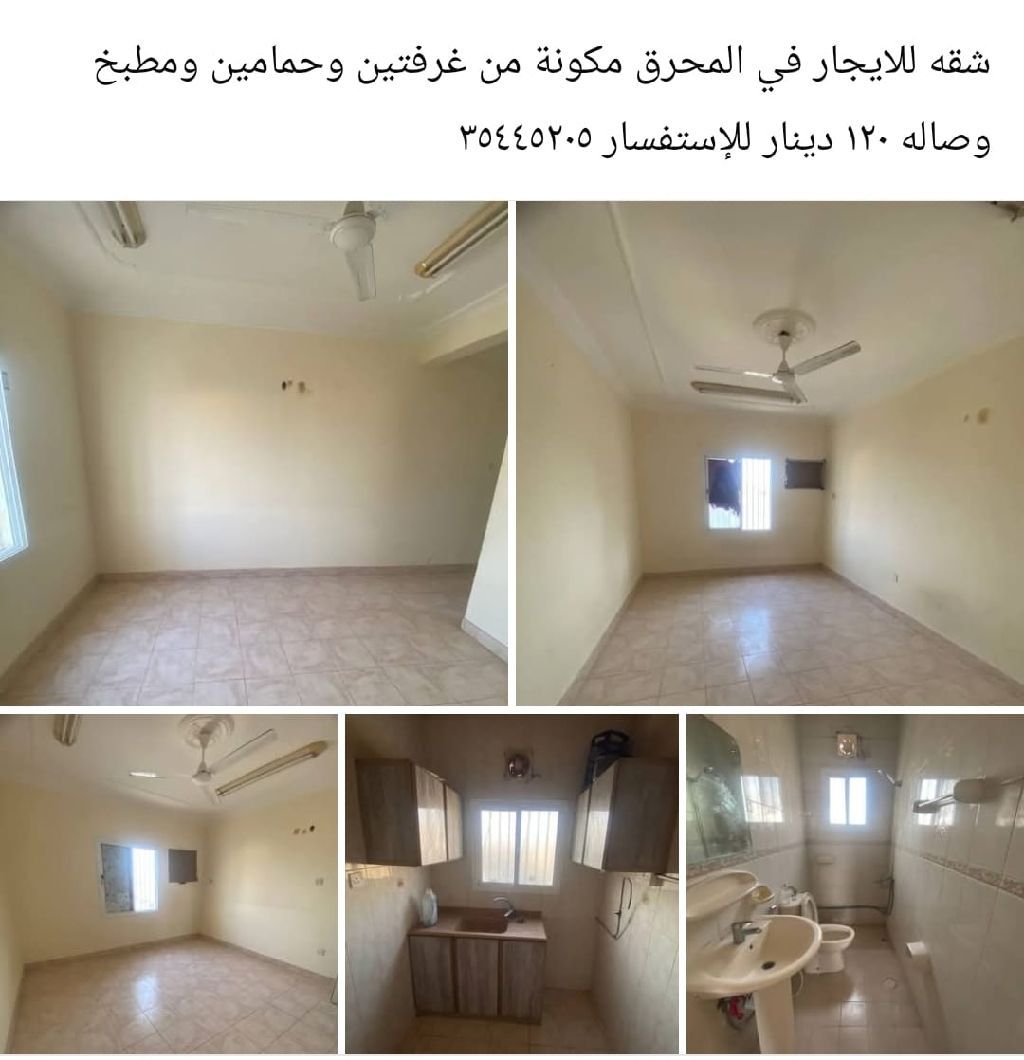 شقة للإيجار في المحرق مكونة من غرفتين وحمامين ومطبخ وصالة بسعر 120 دينار.